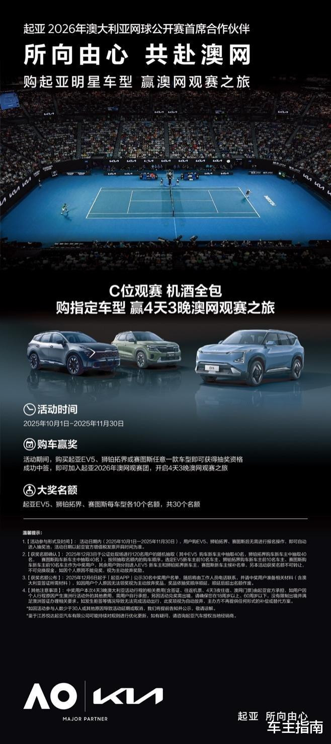 在品牌营销方面,作为与澳网携手走过24年的品牌挚友,起亚继续以首席战略合作伙伴的身份参与其中,为2026年澳网赛事提供全方位的支持。为了让广大用户朋友们有机会沉浸式体验蓝色澳网的独特魅力,起亚还特别推出了“所向由心 共赴澳网 购起亚明星车型 赢澳网观赛之旅”活动,在11月30日前,购起亚EV5、狮铂拓界、赛图斯等指定车型,即有机会加入起亚2026年澳网观赛团,开启4天3晚澳网观赛之旅。